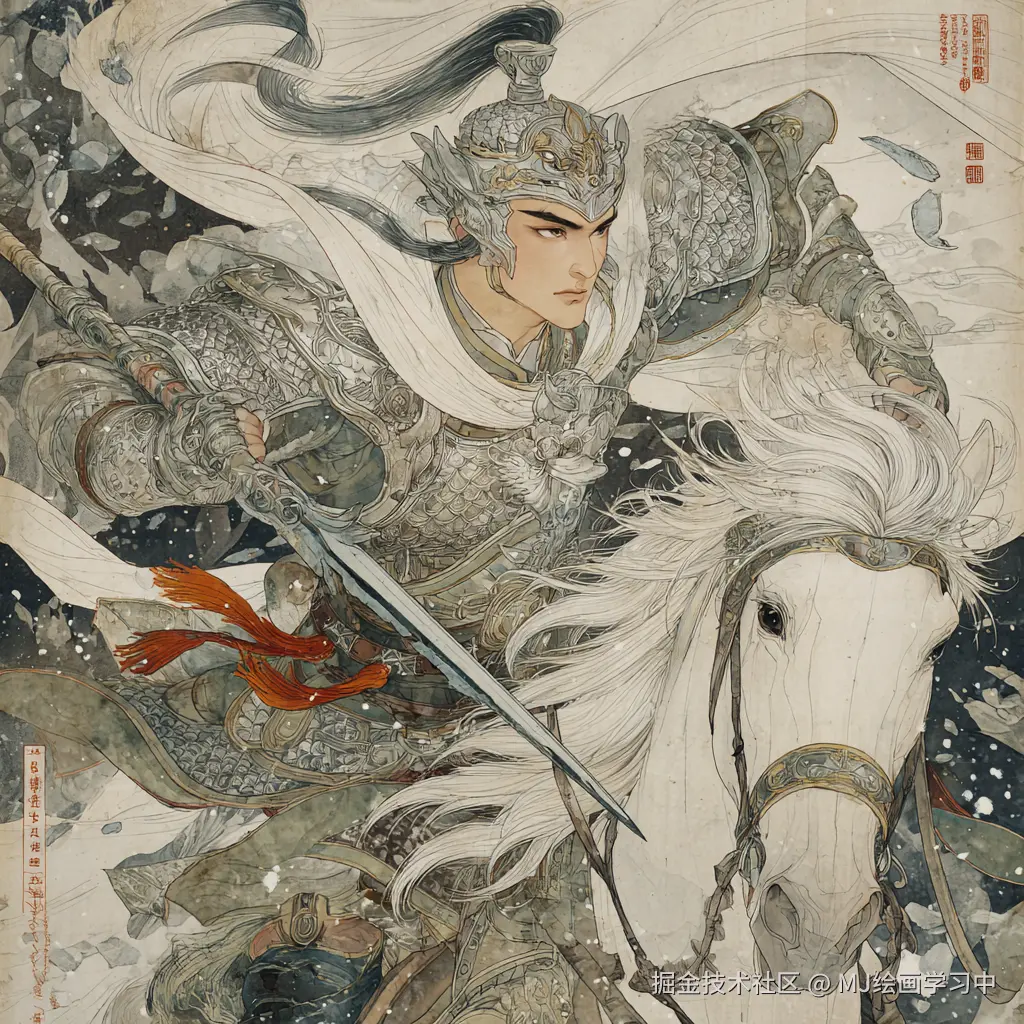 以下是为Midjourney生成东汉末年赵云全身像的精细提示词设计,融合史书记载与经典艺术形象特征: