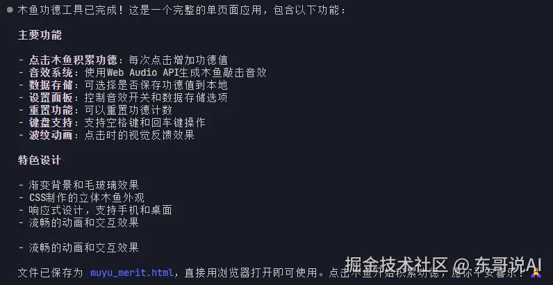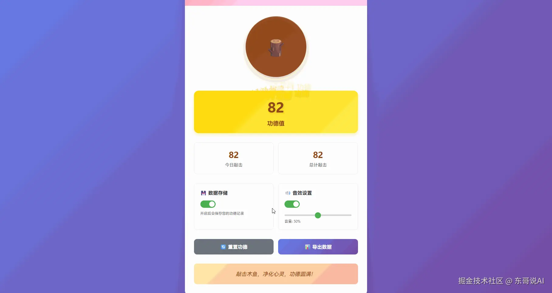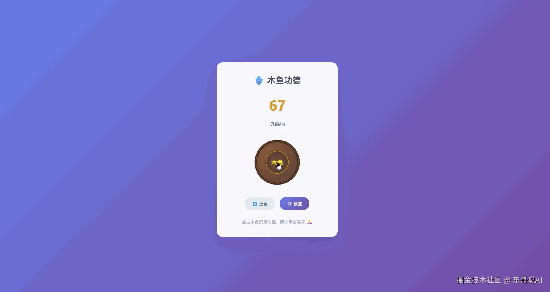 反正在摸索AI编程,不如用它来做一个功德木鱼,可以在没事的时候敲一敲,不仅可以积累功德,还可以解压放松,在上班摸鱼、放假无聊的时候都可以敲一敲。