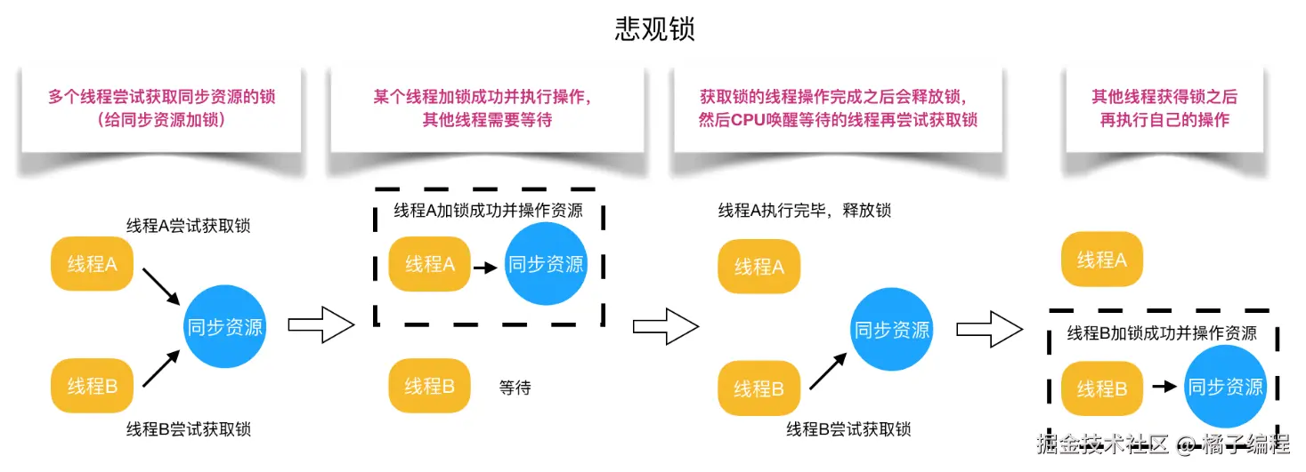 悲观锁是就是悲观思想,即认为写多,遇到并发写的可能性高,每次去拿数据的时候都认为别人会修改,所以每次在读写数据的时候都会上锁,这样别人想读写这个数据就会block直到拿到锁。java中的悲观锁就是Synchronized,AQS框架下的锁则是先尝试cas乐观锁去获取锁,获取不到,才会转换为悲观锁,如RetreenLock。