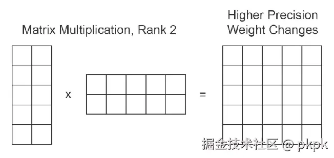 如果我们希望我们的 LoRA 方法更加精确,我们可以增加变化矩阵的秩。我们仍然会得到与模型中正在训练的层相同大小的输出矩阵,但我们让每个变化矩阵编码更多信息,这样当它们相乘时,得到的结果数字会更加精确