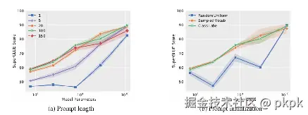 - Prompt Tuning 论文中还探讨了 Prompt token 的初始化方法和长度对于模型性能的影响。Prompt token 的长度在20左右时的表现已经不错(超过20之后对模型的性能提升不明显了),这个gap也会随着模型参数规模的提升而减小