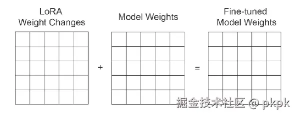 然后,我们只需将乘以变化矩阵后的结果加到我们要微调的层的原始矩阵上,从而得到一个崭新的微调模型