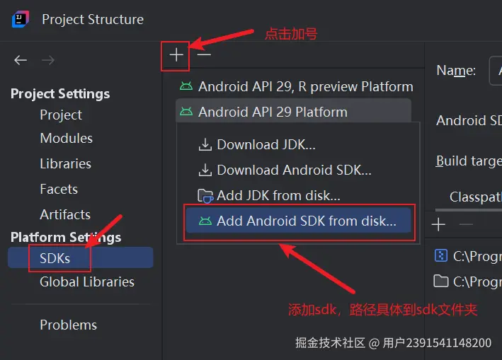 在 IDE 中添加 Andriod SDK,shift+ctrl+alt+S 调出 Project Structure,选择 SDKs,点击“+”添加 SDK