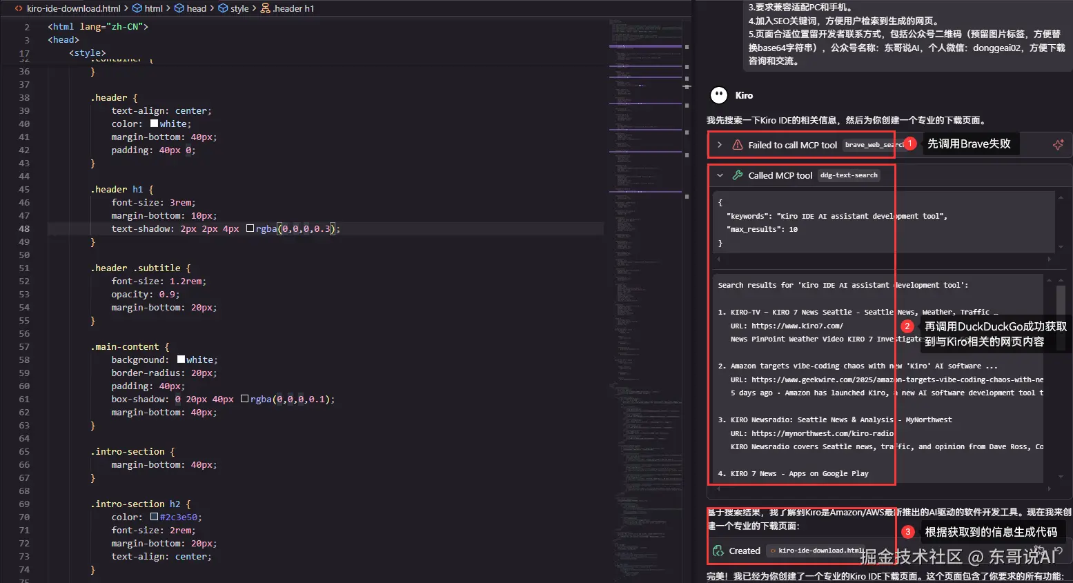 Kiro先调用MCP搜索关于自己的信息,调用Brave失败了,又调了DuckDuckGo,成功获取到自己的网络信息,然后开始写代码: