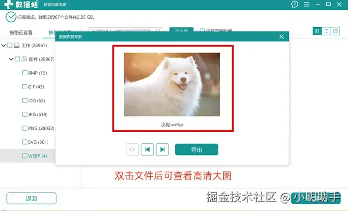 步骤2: 在扫描出来的图片中,我们可以根据图片的缩略图来定位自己的目标相片;选中照片后点击按钮将相片导出并选择新的位置进行重新保存。