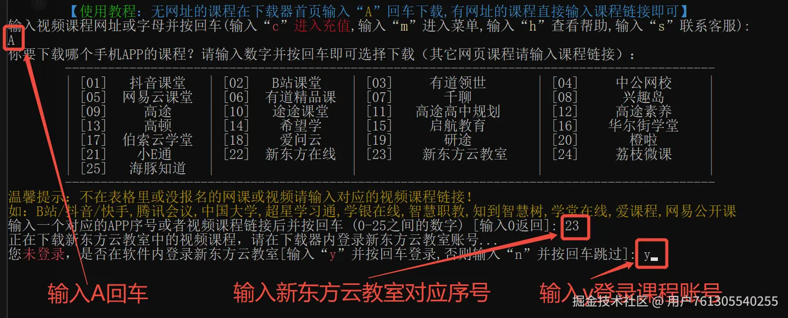 【详细教程】如何下载新东方云教室上面已购买的视频课程 用户761305540255 2025-07-20 171 阅读1分钟 前言:很多同学都想知道新东方云教室视频课程怎么下载,但是新东方云教室上面已购买的视频课程是不提供直接下载方式的,所以下面就教大家如何下载新东方云教室上面已购买的视频课程。 一、下载器首页输入A回车,再输入新东方云教室对应序号并按回车,提示登录,再输入Y登录对应的新东方云教室账号 二、此时会有弹窗让你登录,选择对应登录方式登录新东方云教室账号即可 三、登录后会出现已购买的课程列表,找到要下载的课程,输入对应序号并回车 四、然后会提示输入下载选项,直接回车即可,可以批量自动下载视频文件 五、下载好后的文件可在本地路径下的Download目录中找到,可用播放器打开 六、学无止下载器获取地址 www.xuewuzhi.cn/roombox_dow…