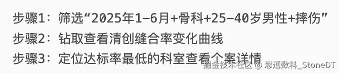 - 效能提升:季度医疗质量分析从原需3人周缩减至单人2小时完成