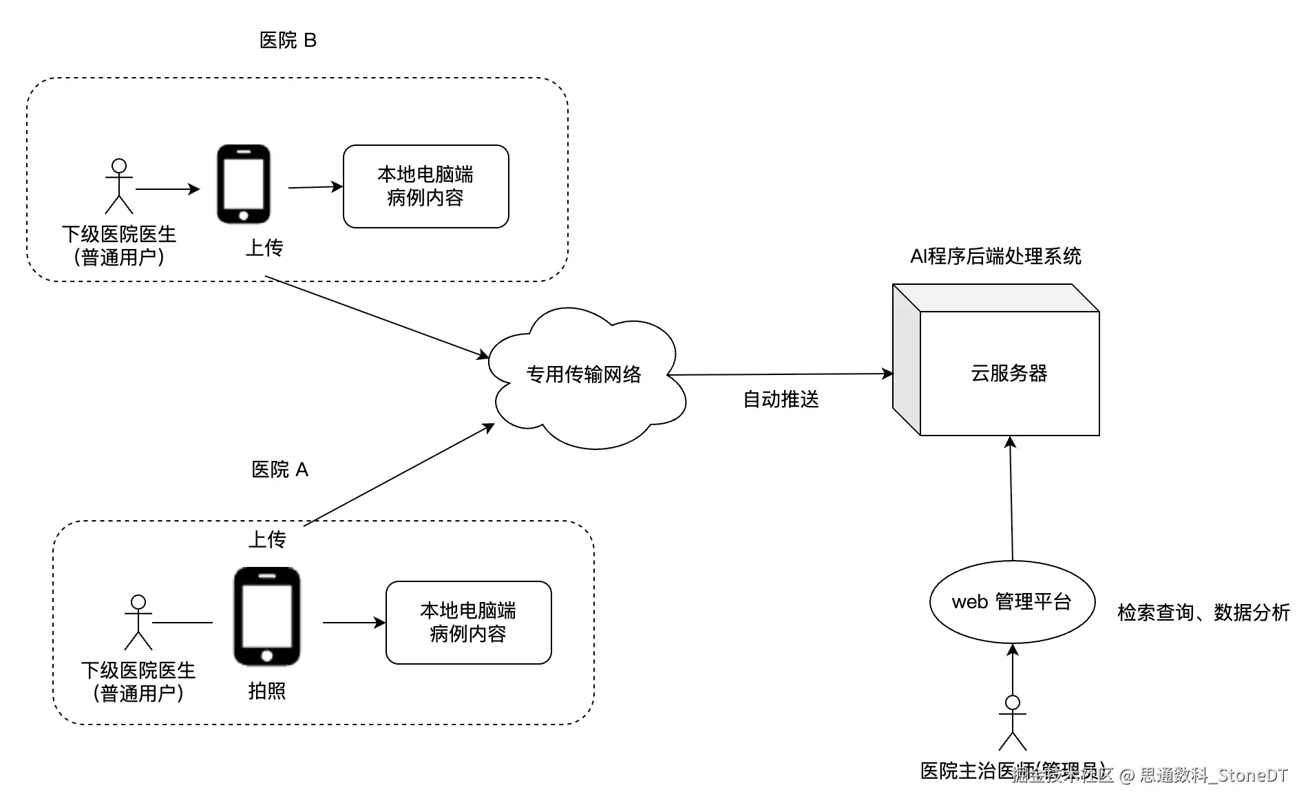 本方案针对某省医联体医院病例数据管理需求,通过AI技术实现病历数字化→信息结构化→数据应用化的全流程改造。系统采用双端协同架构: