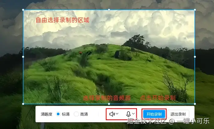 步骤2:选好录制模式后,确定好屏幕录制区域。另外,声音从哪来也得设置好。要是你想让录出来的视频格式、清晰度合自己心意,可以点击 “输出设置” ,在里面就能随心调整。等这些都弄妥当了,点一下 “开始录制” 按钮,录屏就正式开始啦。