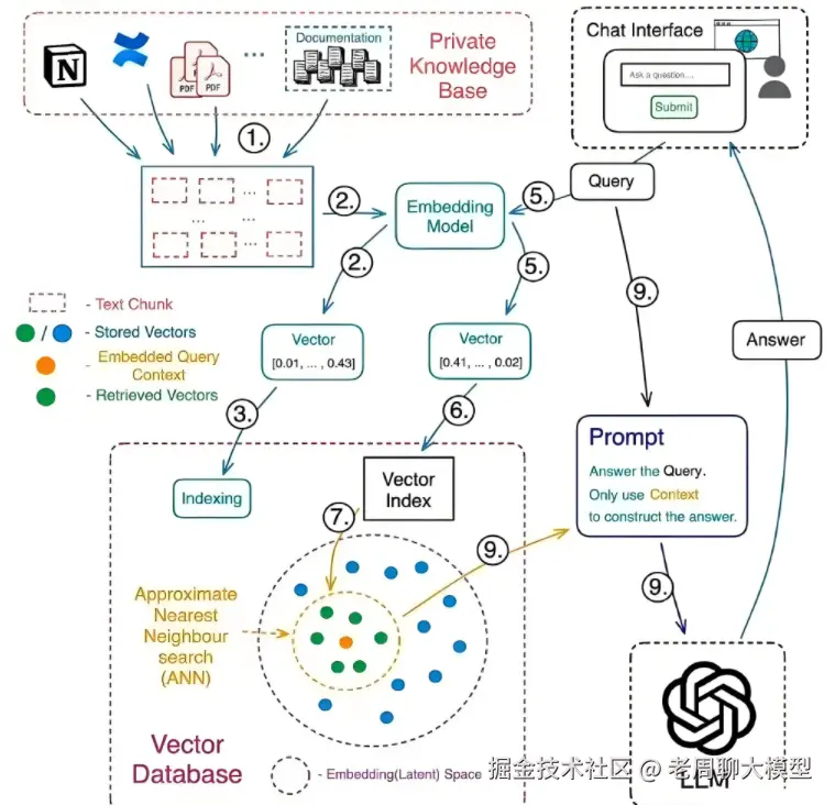 - 检索(Retrieval) :基于用户查询,从数据库或知识库中召回相关上下文片段(如文档、网页内容)。