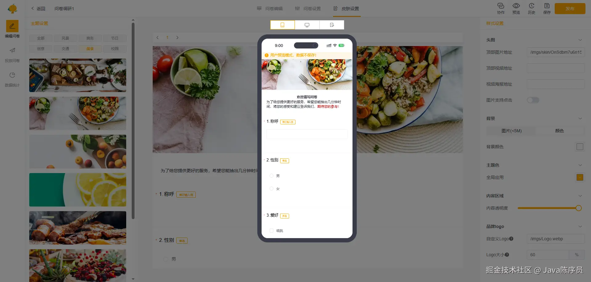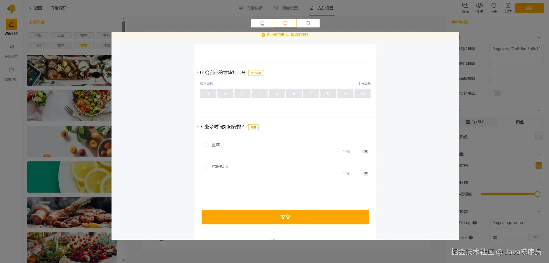 - 问卷设计高效灵活:提供文本输入、选择、判断、评分、投票、多级联动等题型;问卷支持时间配置、提交限制、皮肤设置、多人协作等