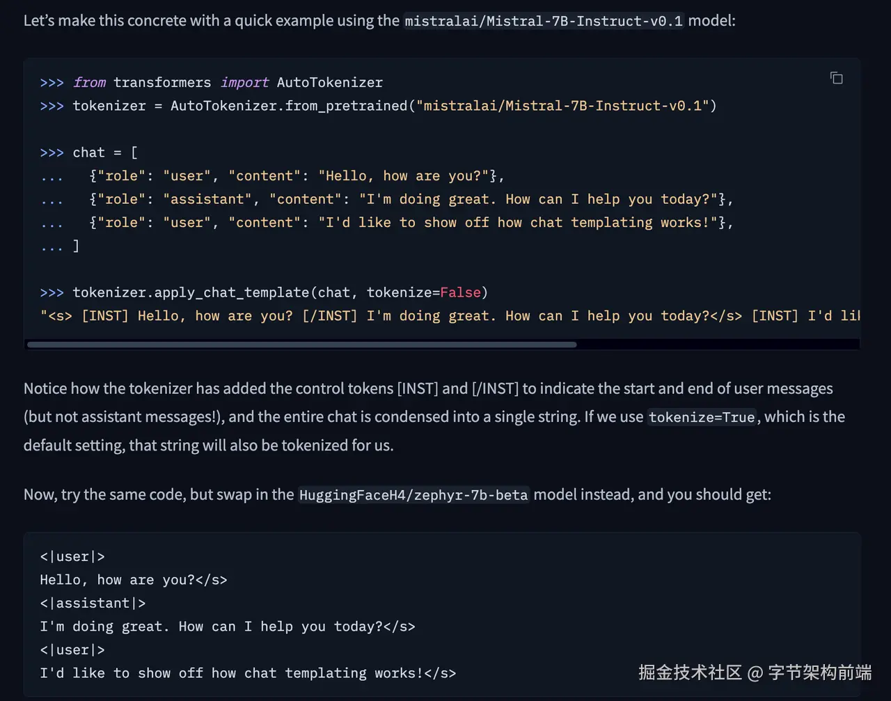 在框架里通常会帮你封装对话模版 chat-template ,里面就会涉及到 Special Token 的封装,比如下文面图片中, hugging face 的转换例子