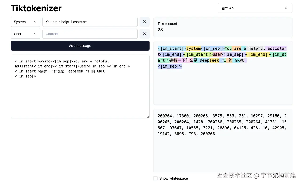 那每段话具体的表达是什么的?还是可以用这个网站tiktokenizer.vercel.app/ 来看,上面有许多模型的tokenizer。