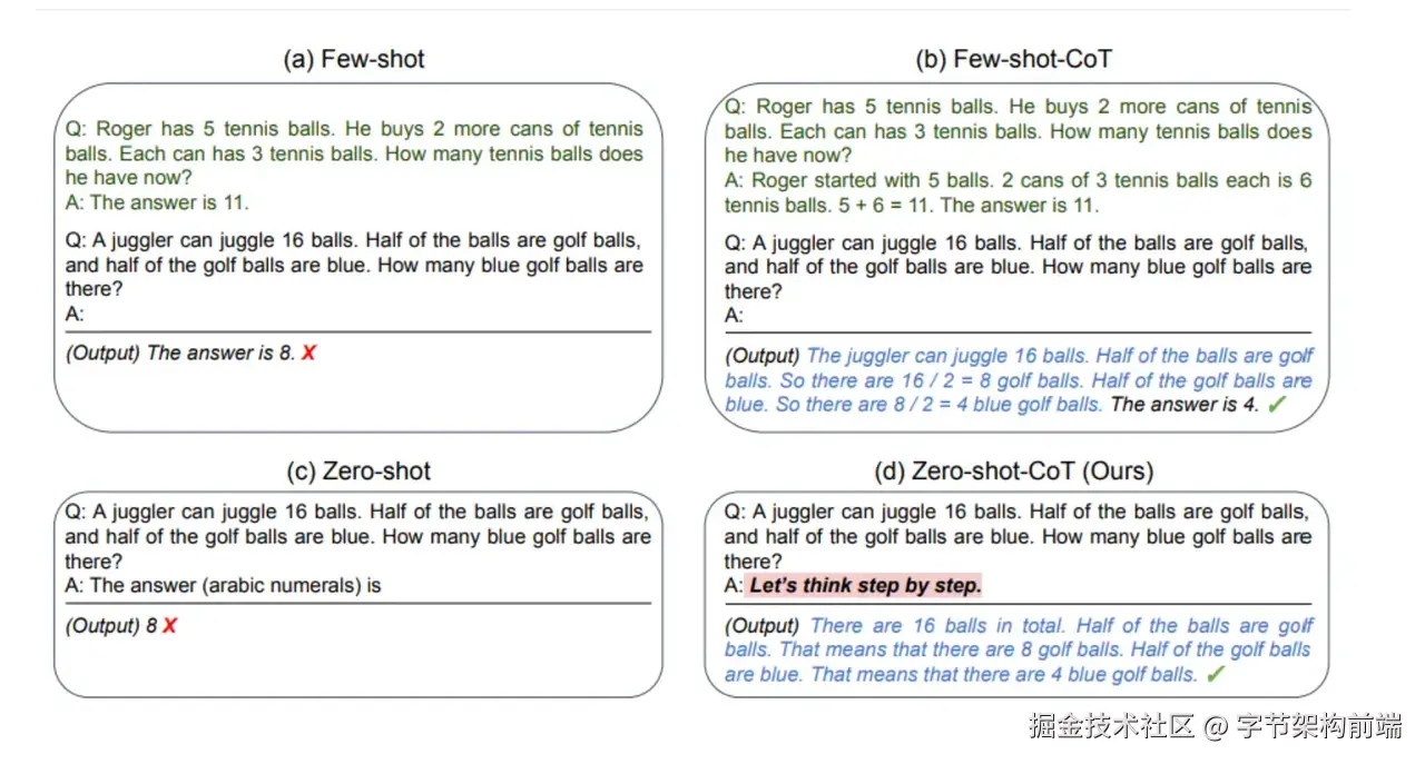 3. COT (chain of thought) 思维链,我们可以让模型一步一步思考,不要立刻给出答案,可以结合 Few-shot 给他一些思考的例子。