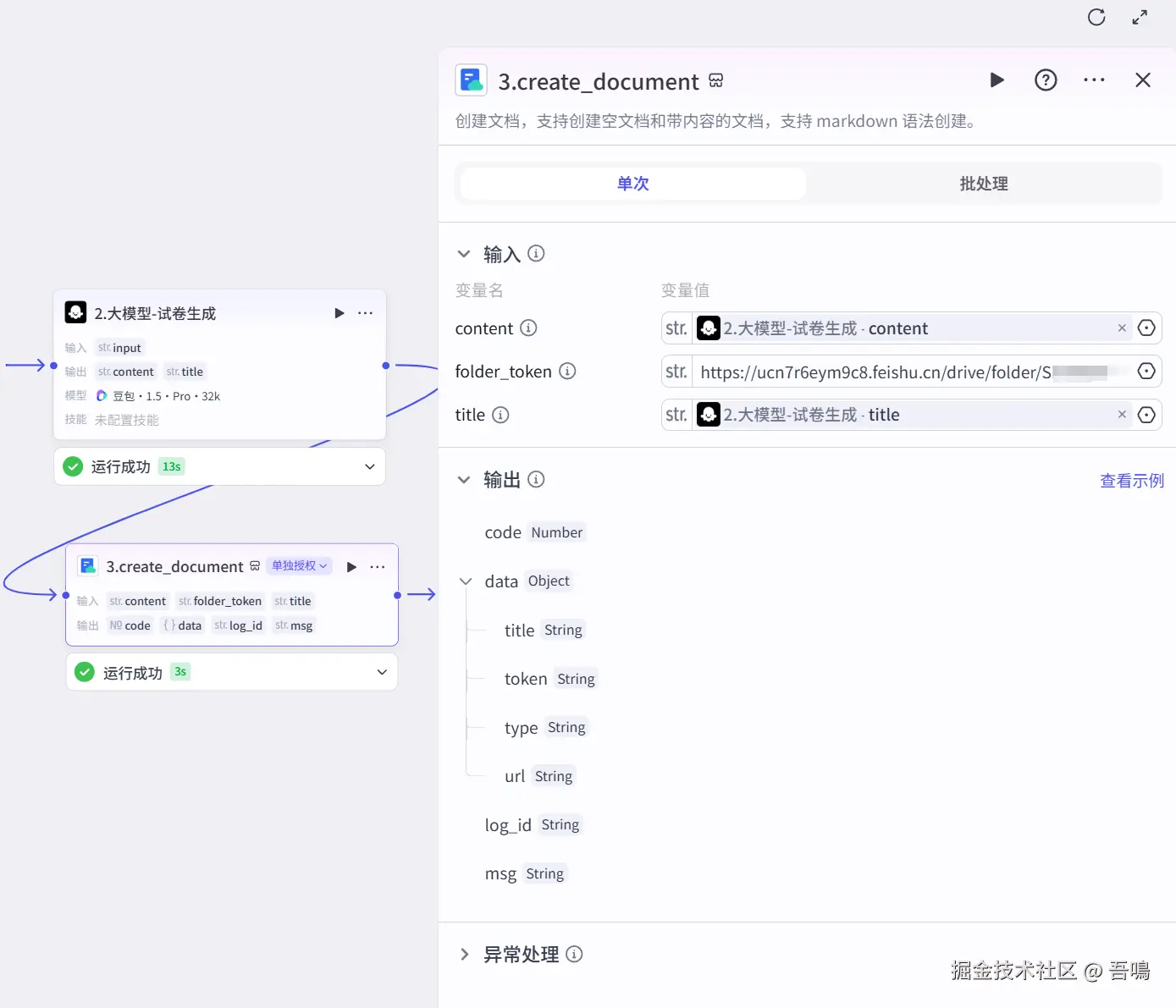 - 功能描述:用于把生成的考试试卷内容写入到飞书文档中