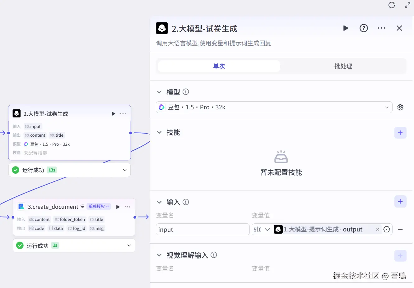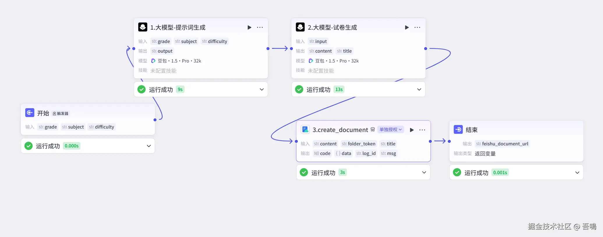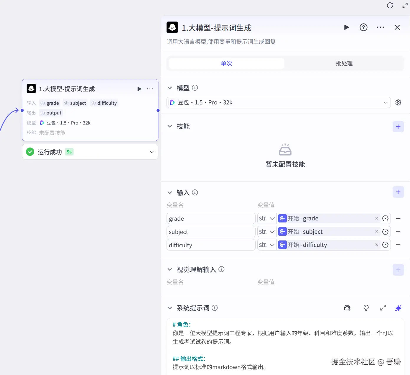 - 功能描述:接收“生成提示词”节点输出的提示词,生成考试试卷