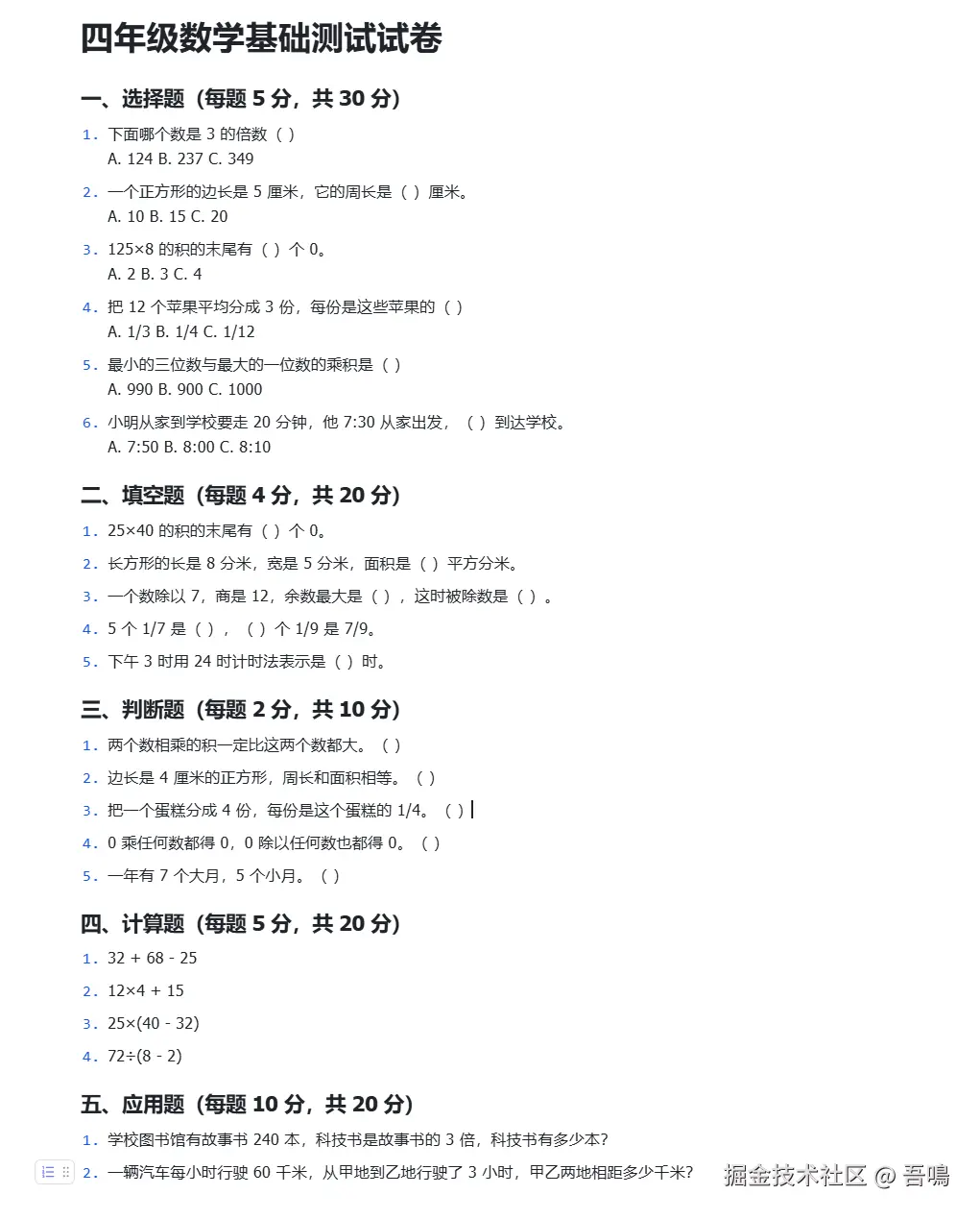 最近有位家长给吾鳴留言,说暑期已至,每次娃温习功课之后,问娃掌握的如何,娃都说掌握的很好,知识点太简单了。于是乎,就想出点题目考考娃,看看他的真实水平如何,知识点是否都掌握。但是每次出题都很耗时间,专不专业还另说。