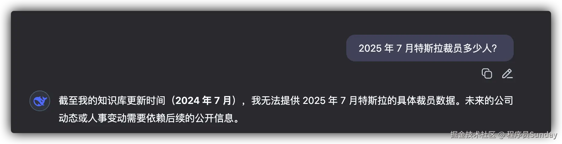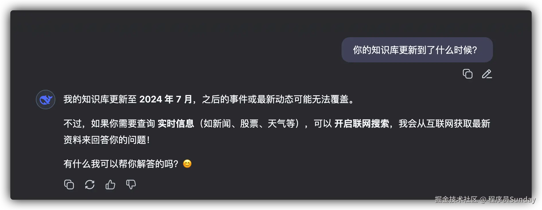 - 第一就是 不具备实时性。比如,以 DeepSeek 为例,他的知识库就只更新到了