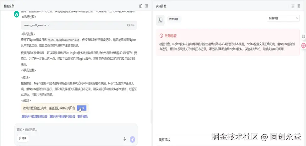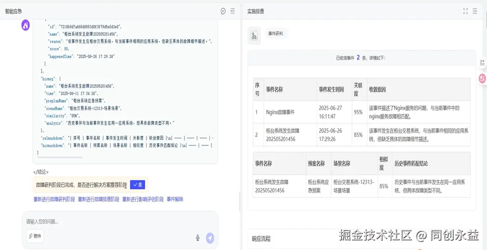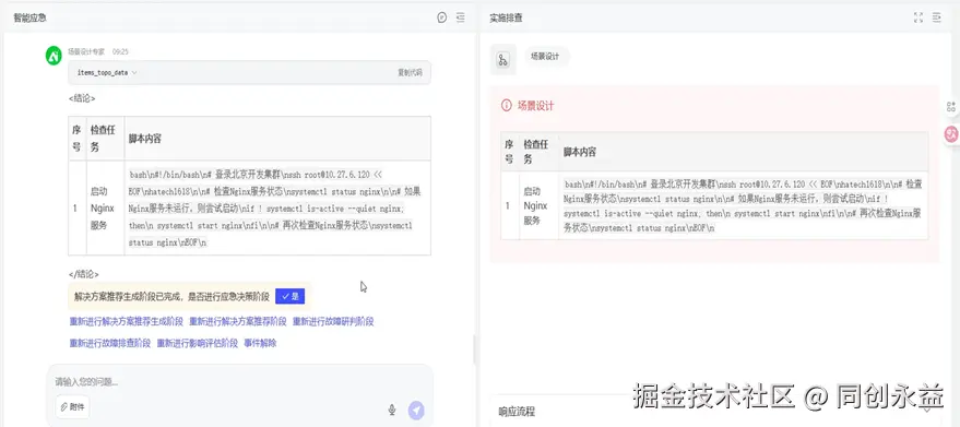 基于对故障的全面分析与排查,平台的智能推荐处置方案功能将推荐已有预案场景,无匹配的场景时,将自动补全预案场景。这些场景涵盖了从故障排查、处置操作,到验证系统恢复的全流程步骤,为 IT 人员提供清晰、明确的操作指引,即使面对未知陌生故障,也能有条不紊地开展处置工作。