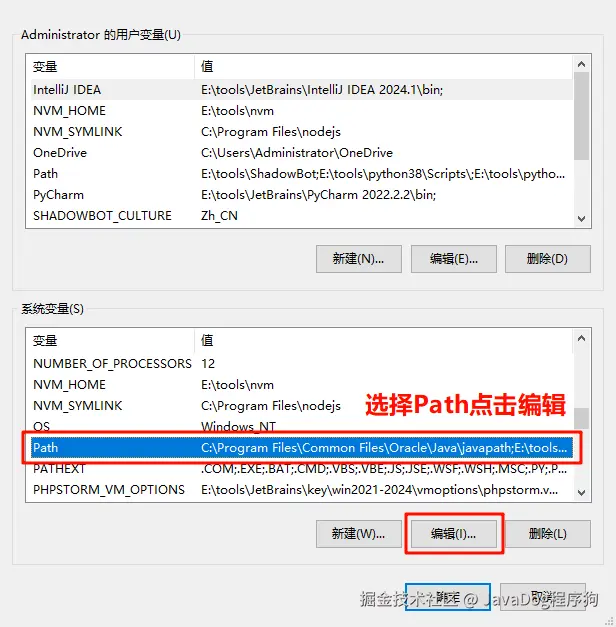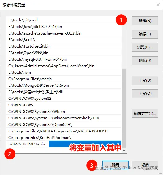 将%JAVA_HOME%\bin变量加入其中,并确认