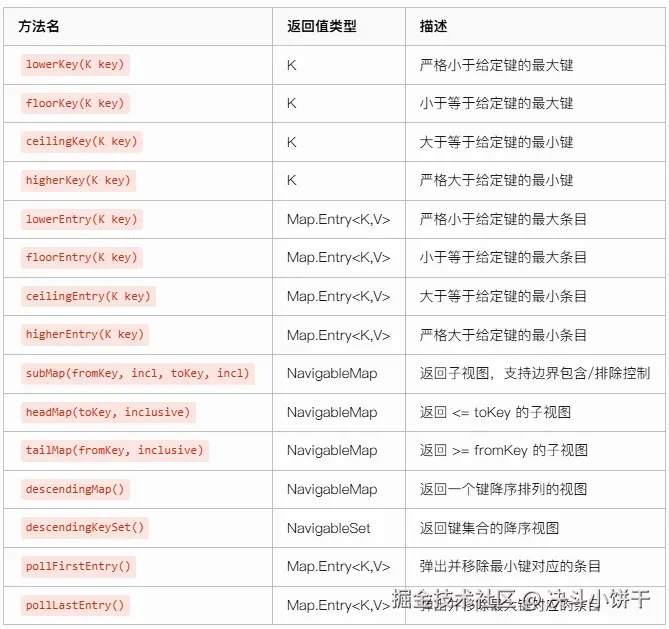 它扩展了 SortedMap,支持更丰富的范围查询与方向遍历操作。