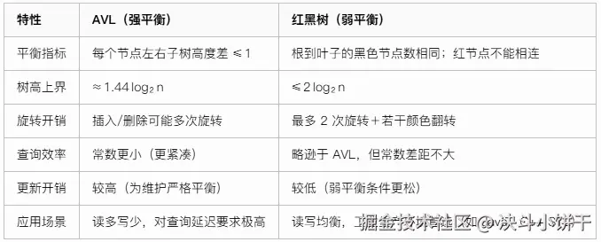 AVL树在插入和删除时会进行更多的旋转操作,以确保任意节点左右子树的高度差不超过1。而红黑树允许一定程度的不平衡,以减少调整频率,提高插入删除的效率。
