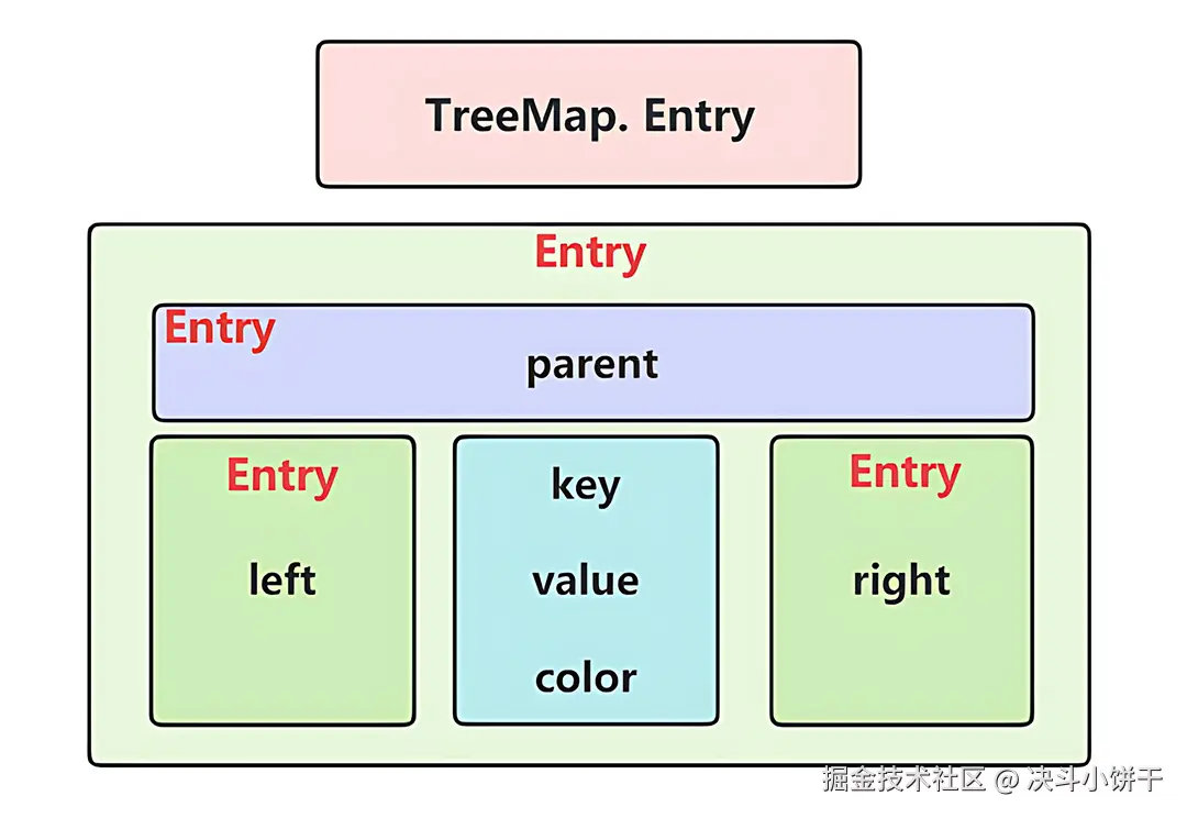 key、value和color为当前对象的值,其它字段为构成红黑树所需的节点对象。数据结构如图: