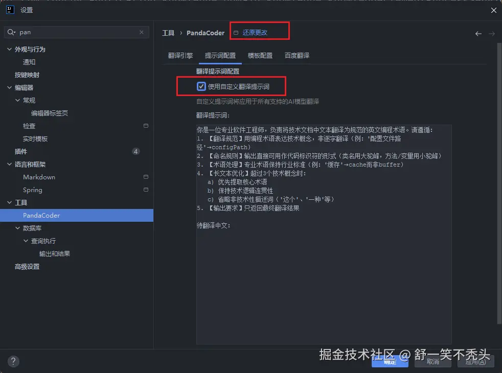 提示词配置页面配置对应的提示词,插件自带提示词设置,假如此处你有更好的提示词可以在这里进行配置,如果此处配置的不好,也可以点击还原更改将提示词进行重置。