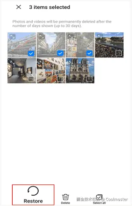 第三步: 选择您需要的图片,然后点击底部的“恢复”。