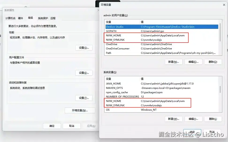 以下是我示例电脑上的环境变量设置参考。我上面说的动态链接说的就是 NVM_SYMLINK 。