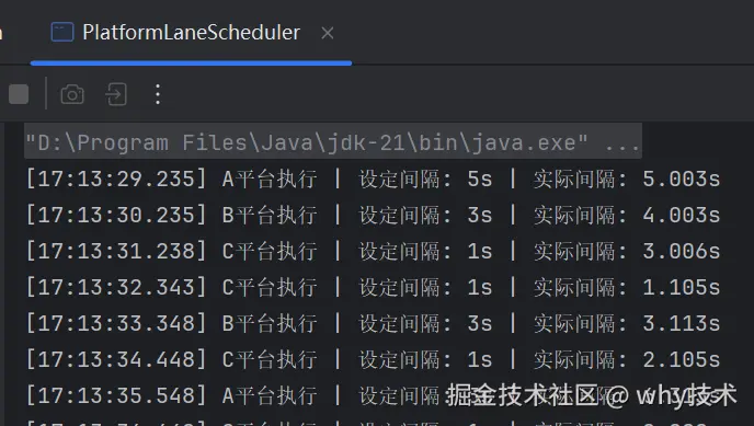 System.out.printf("[%tT.%tL] %s平台执行 | 设定间隔: %ds | 实际间隔: %.3fs%n",
