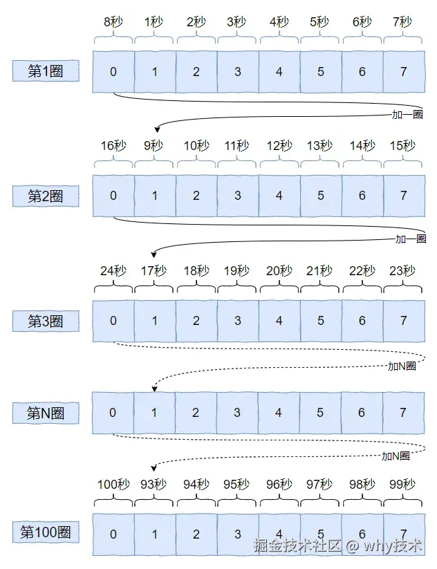 虽然数组长度只有 8,但是它可以在上叠加一圈又一圈,那么能表示的数据就多了。