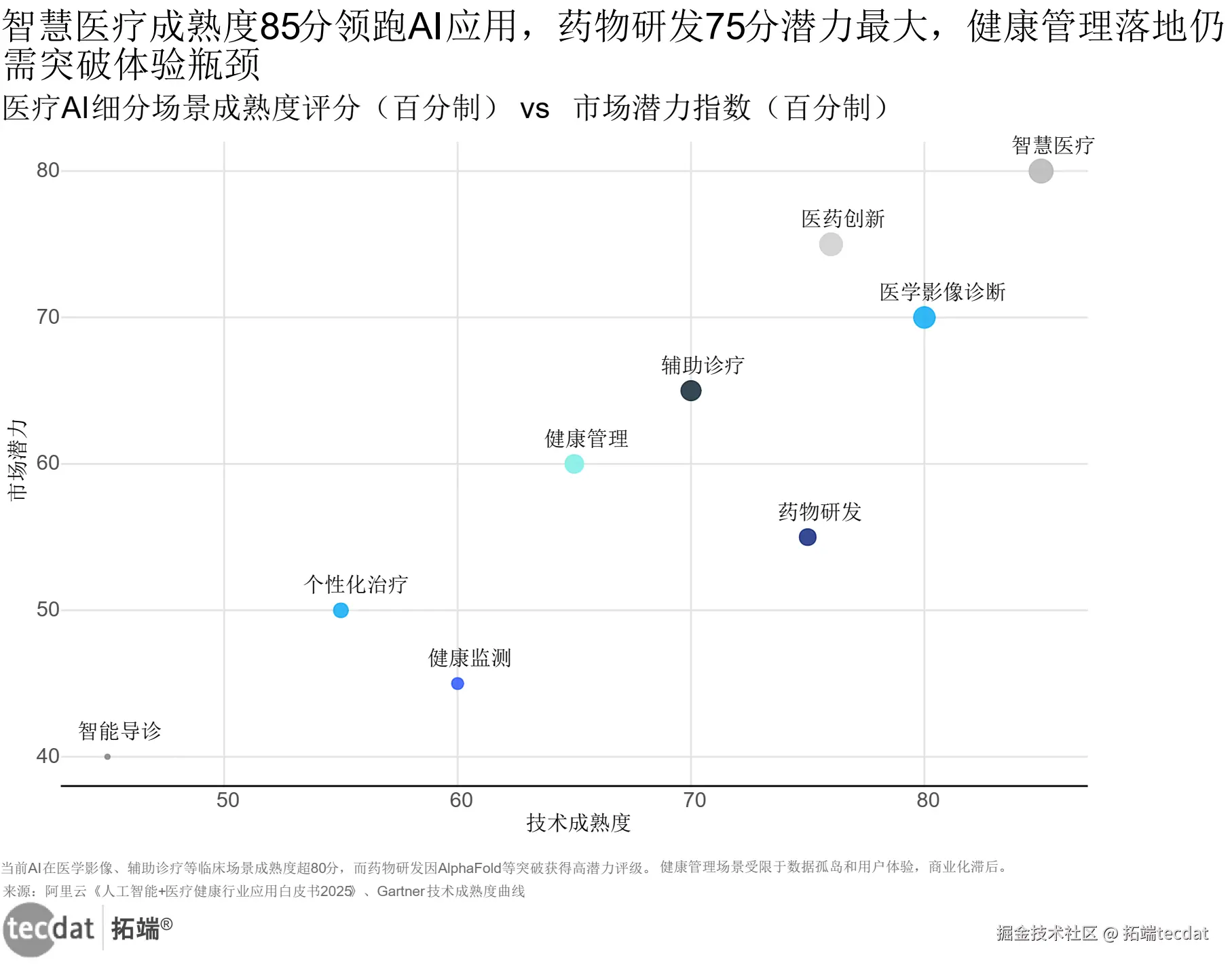 AI医疗应用成熟度矩阵:智慧医疗85分领跑,健康管理需突破数据孤岛(来源:阿里云+Gartner技术成熟度曲线)