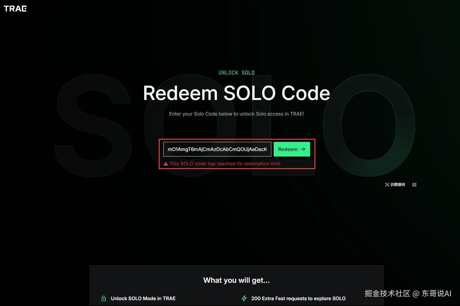 晚上蹲了一个多小时,只为守着抢到Trae SOLO邀请码,原以为我的手速够快了,没想到最后还是没抢到: