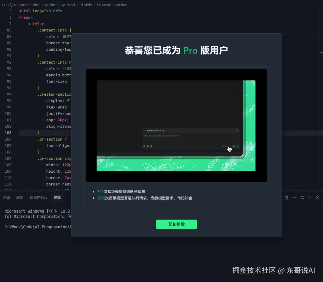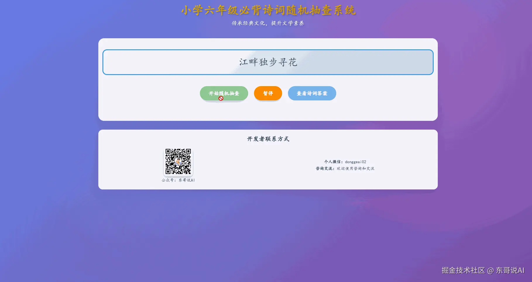 6.页面合适位置留开发者联系方式,包括公众号二维码(预留图片标签,方便替换base64字符串),公众号名称:东哥说AI,个人微信:donggeai02,方便使用咨询和交流。