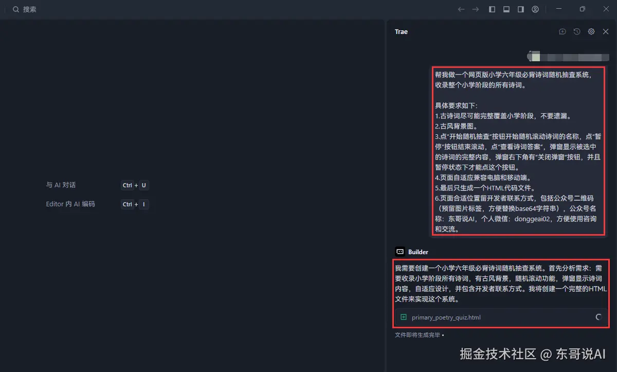 本来准备用Kiro开发一个小学六年级必背诗词随机抽查系统,那既然Trae还有这么多快速请求次数,那就来狠狠压榨Trae吧。