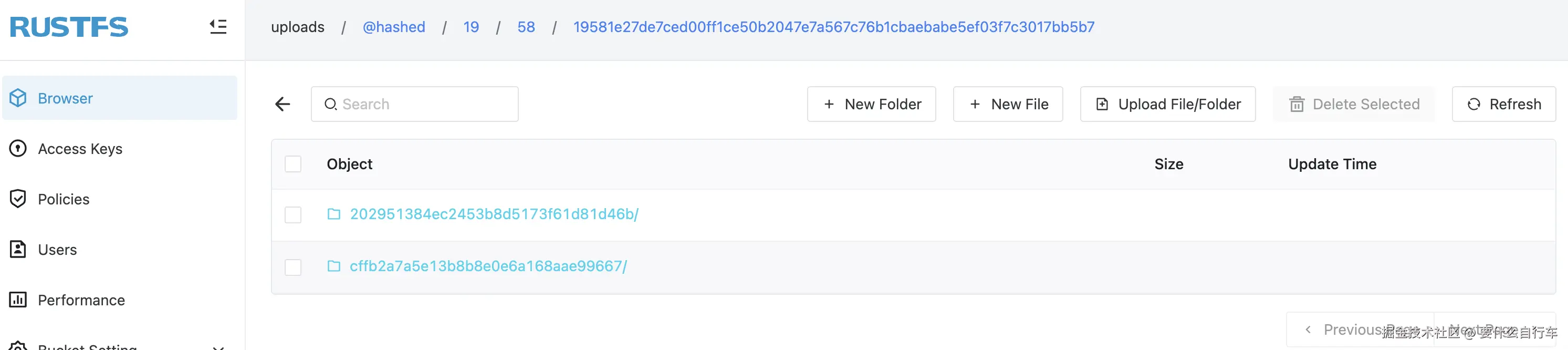然后在 RustFS 控制台的 uploads bucket 中查看是否有数据:
