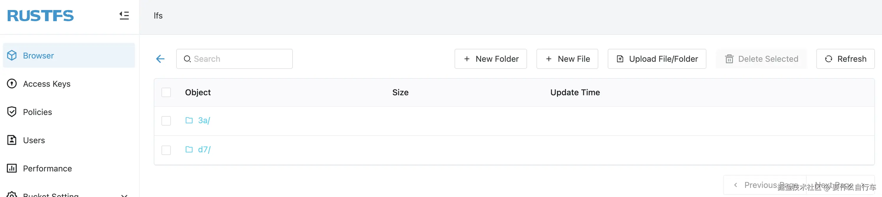 新建一个 txt 文件并写入任意内容,然后通过 git 三部曲(add & commit & push)将其推送到远端仓库。然后在 RustFS LFS bucket 中查看是否有数据存在: