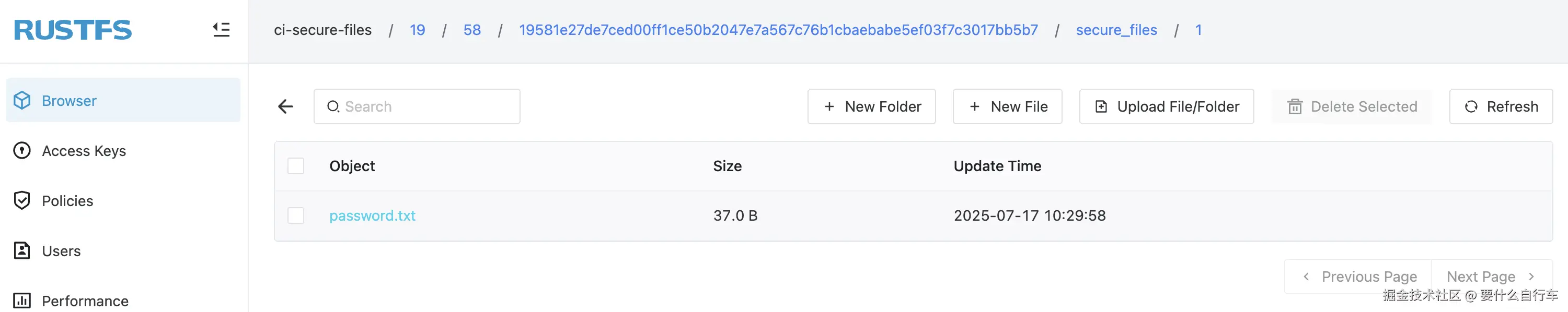 可以看到 password.txt 文件已经存储在 ci-secure-files bucket 中了。说明 RustFS ci-secure-files 在 GitLab 中配置成功。