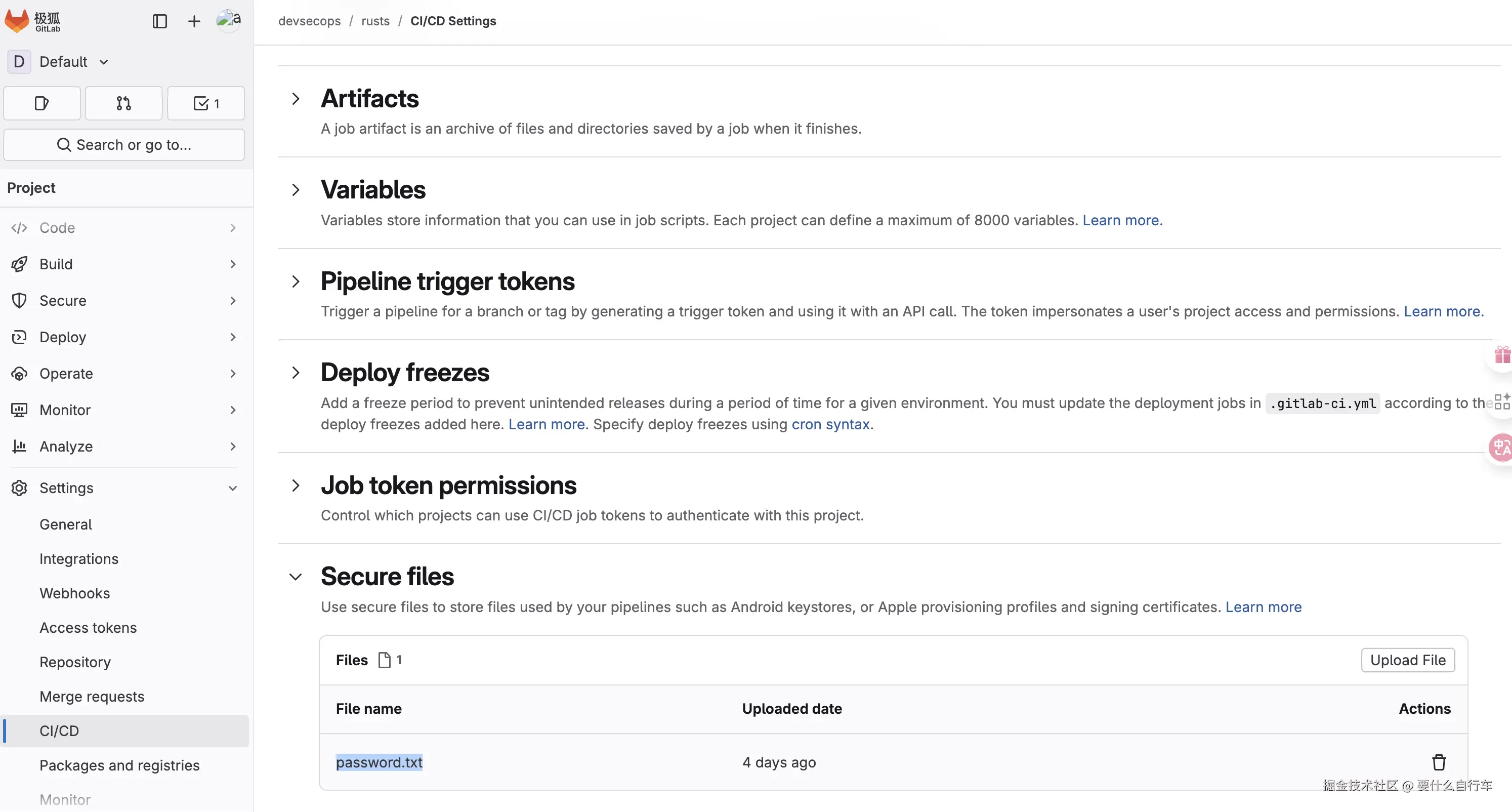 然后通过项目 --> 设置 --> CI/CD --> 安全文件 来添加安全文件。将如下内容写一个 password.txt