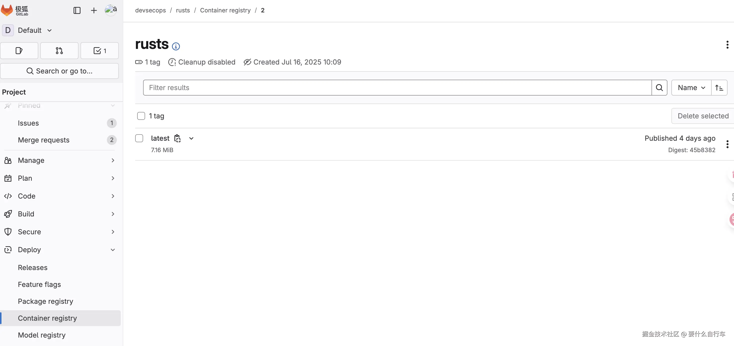 接下来,推送一个容器镜像到 GitLab 内置的容器镜像仓库。使用方法可以在 项目 --> 部署 --> Container Registry 中看到: