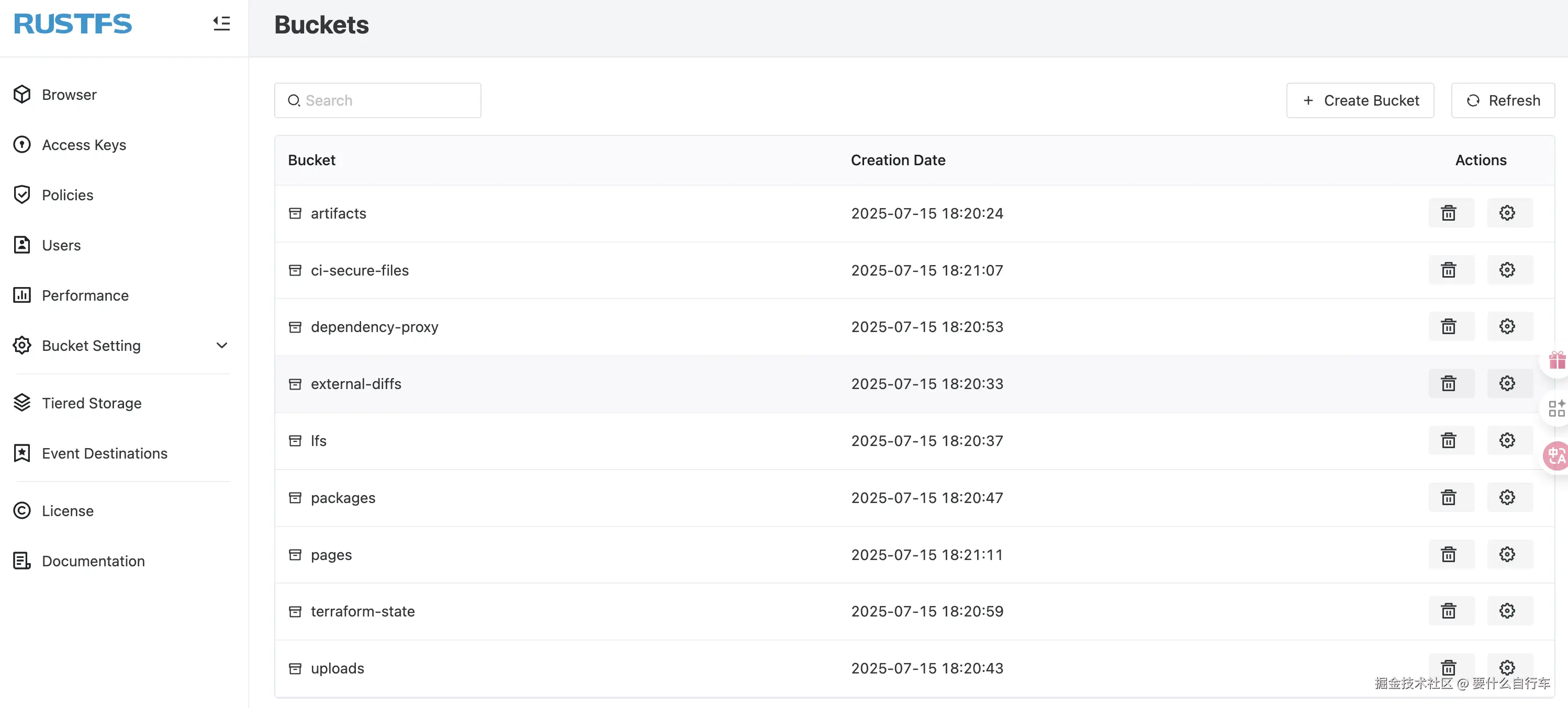 先在 RustFS 上创建好所需的对象存储桶。在 RustFS 控制台页面的右上角,点击 Create Bucket 即可创建所需的 bucekt。本次创建了 artifacts、ci-secure-files、dependency-proxy、external-diffs、lfs、packages、pages、terraform-state、uploads存储桶,用于存储不同的数据。