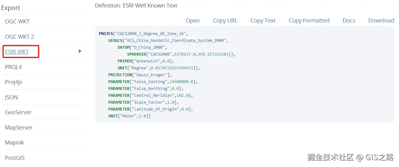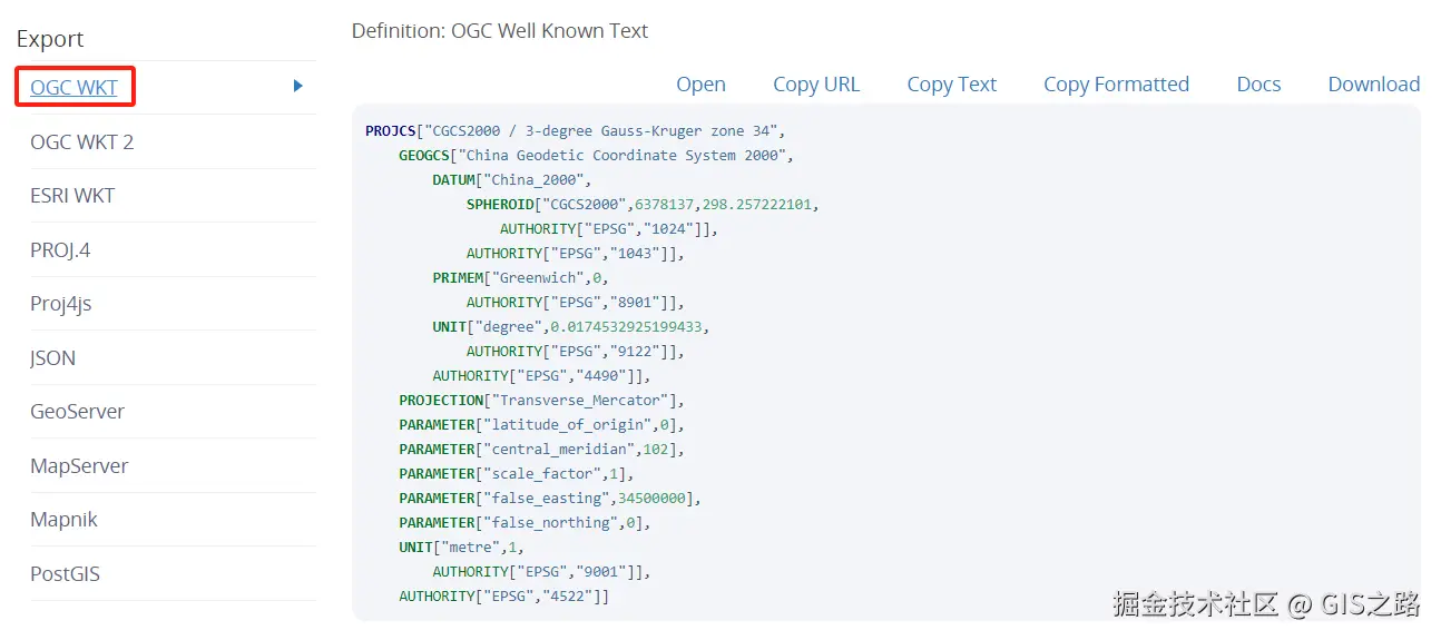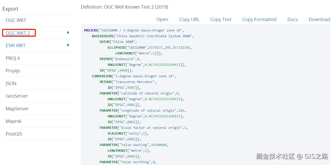 从https://epsg.io网站查询出的坐标系信息有多种格式,包括OGC WKT、OGC WKT2以及ESRI WKT等。正常情况下,可以采用OGC WKT、ESRI WKT两种方式定义坐标系。