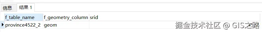 SELECT f_table_name, f_geometry_column, srid FROM geometry_columns WHERE f_table_name = '你的表名'; // 如 province