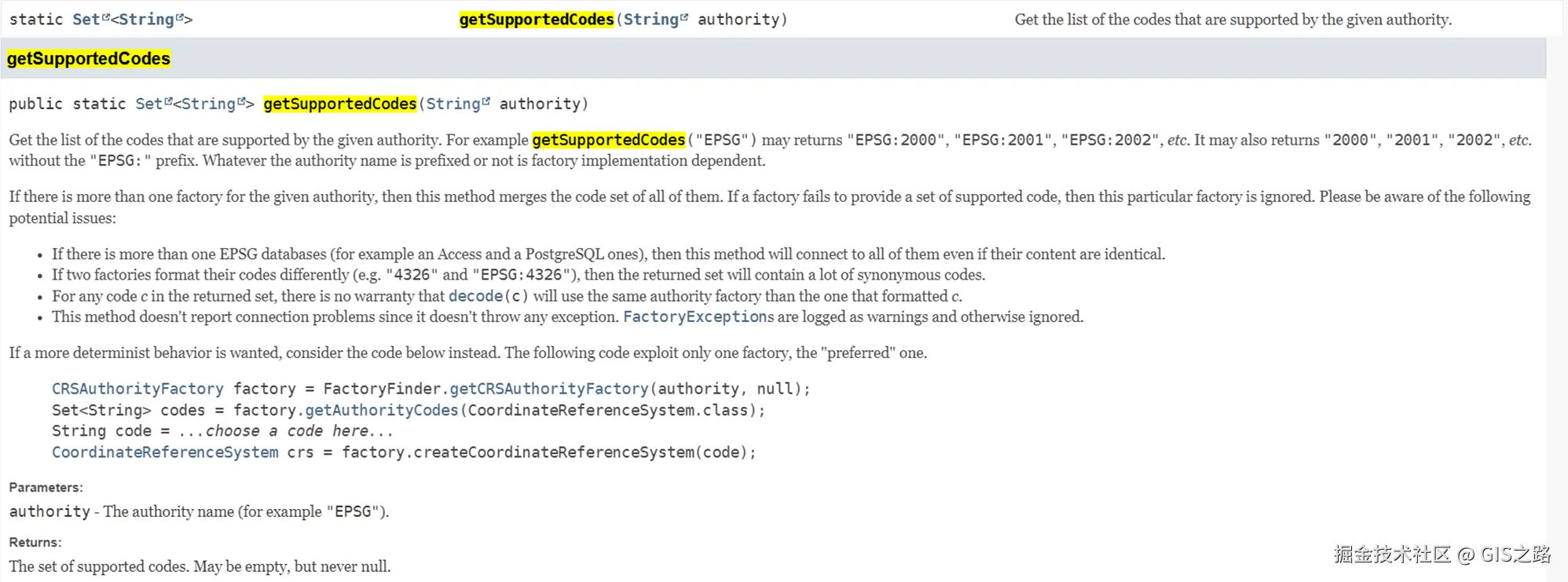 以下介绍一些拓展信息。GeoTools中有一个接口CRSAuthorityFactory提供了getSupportedCodes(String authority)方法,用于获取指定权威机构(authority)支持的所有坐标参考系统(CRS)的代码。这里的authority参数指的是定义CRS的权威机构的名称,如“EPSG”。