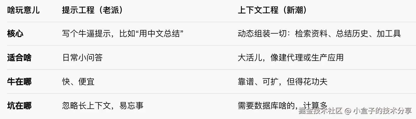 我们做个表格来对比一下 Prompt Engineering 和 Context Engineering