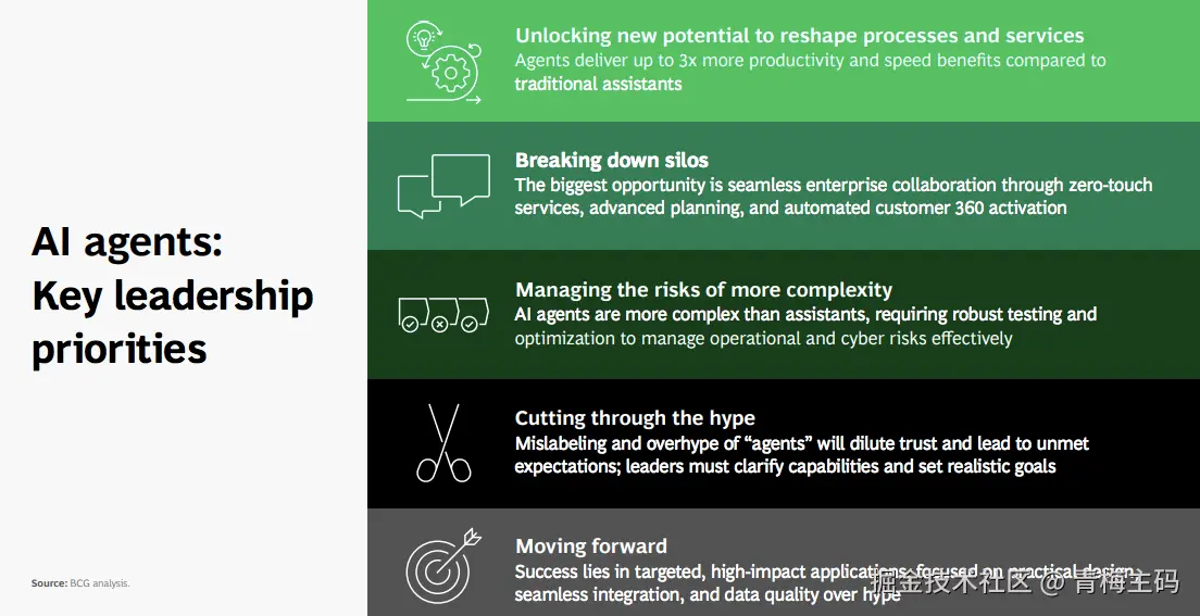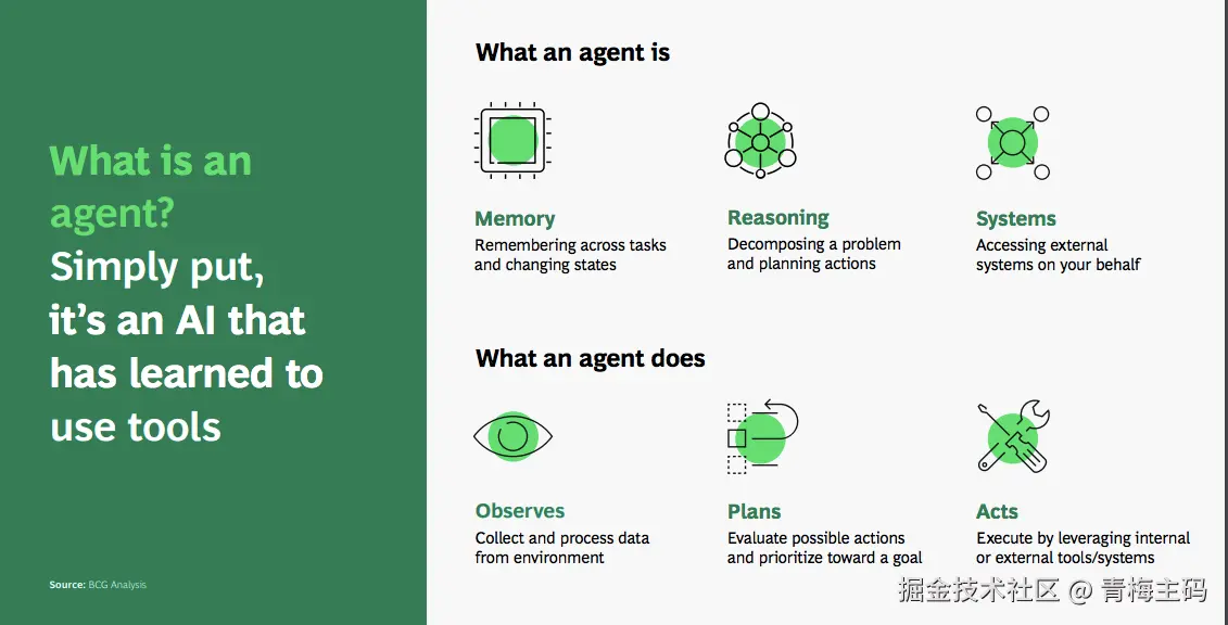 - 超越ChatGPT:具备记忆(Memory)、推理(Reasoning)、系统交互(Systems)能力的AI,可自主规划行动(BCG分析)