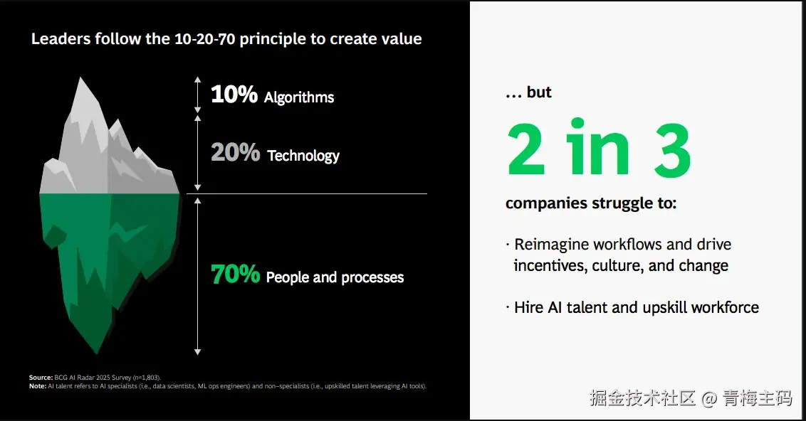 - 2/3企业败在“人”:未能重构工作流或培养AI人才(BCG AI Radar 2025)