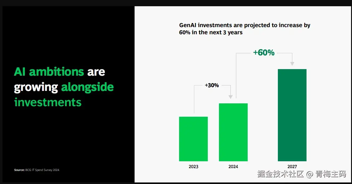 - 60%增长:生成式AI(GenAI)投资预计未来 3 年增长 60%(BCG IT Spend Survey 2024)