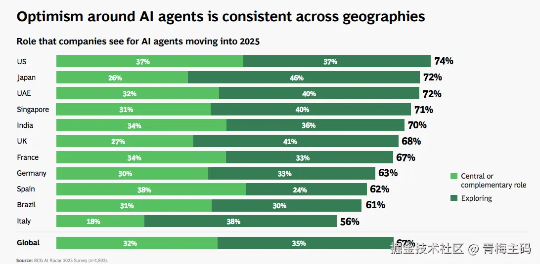 - 1/3企业豪赌:33% 的公司计划 2025 年 AI 投资超 2500 万美元,其中巴西(86%)、意大利(83%)、西班牙(81%)意愿最强(BCG AI Radar 2025)